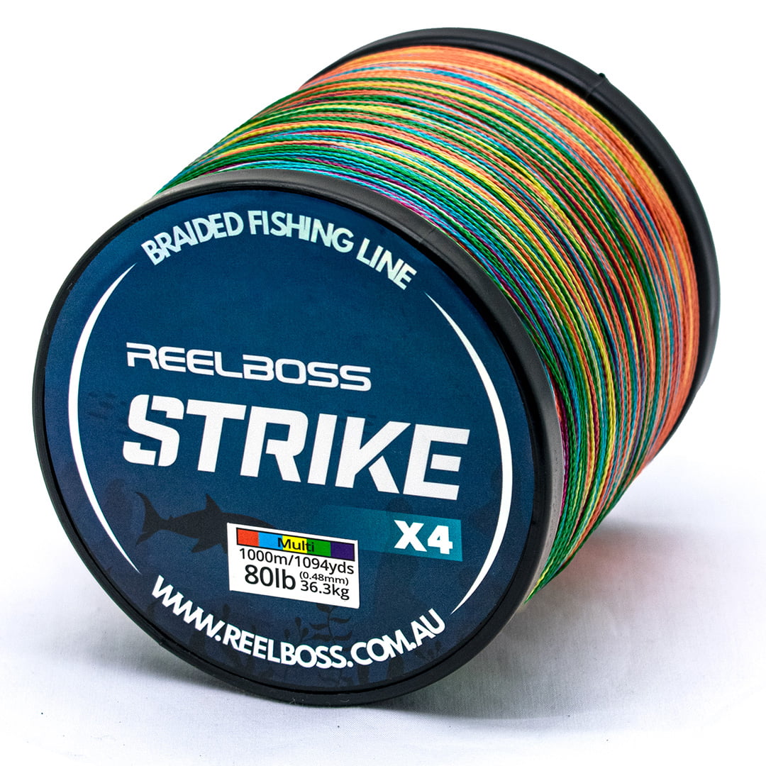 PREMIUM PRO QUALITY MULTI-COLOUR BRAID FISHING LINE ReelBoss Strike x4. Fishermen of all types and styles love this braid fishing line for its super strength, near zero stretch, smooth abrasion resistance that casts farther, no memory, and small diameter. This gives you better performance to avoid snags and tangles while reeling in those big catches that break other lines. Made of extra strong UHMWPE material, a rugged type of polyethylene that is a favorite with serious fishermen. Use this for better results for both fresh water and salt water. No matter your equipment or style, Strike x4 will quickly become your first choice.